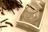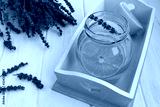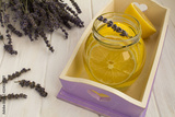 Honey with lemon and lavender in the glass jar in the violet tray on the white wooden background