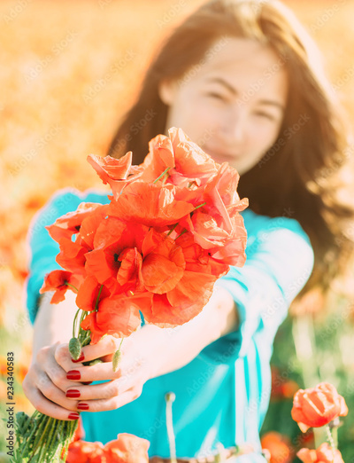 Smiling woman giving a bouquet of poppies.