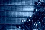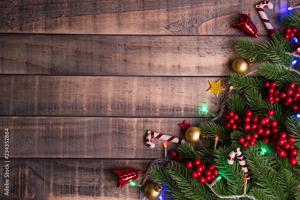 Christmas background concept. Top view of Christmas gift box red sock with spruce branches, pine cones, red berries and bell on old wooden background.