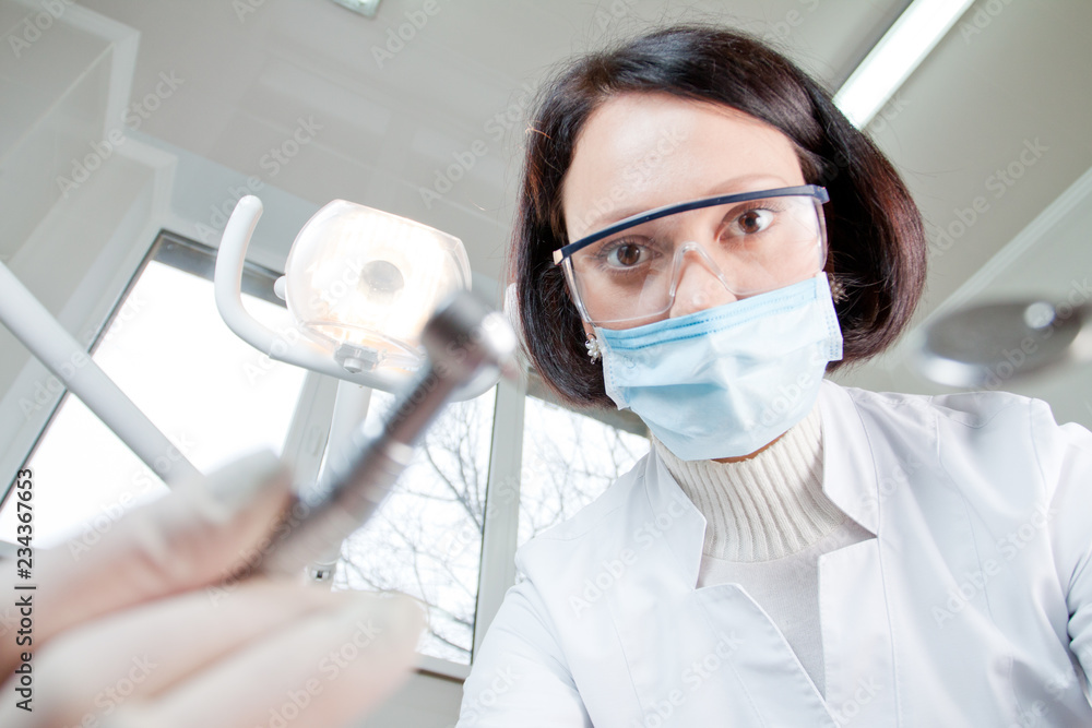 Doctor dentist in mask looks at patient