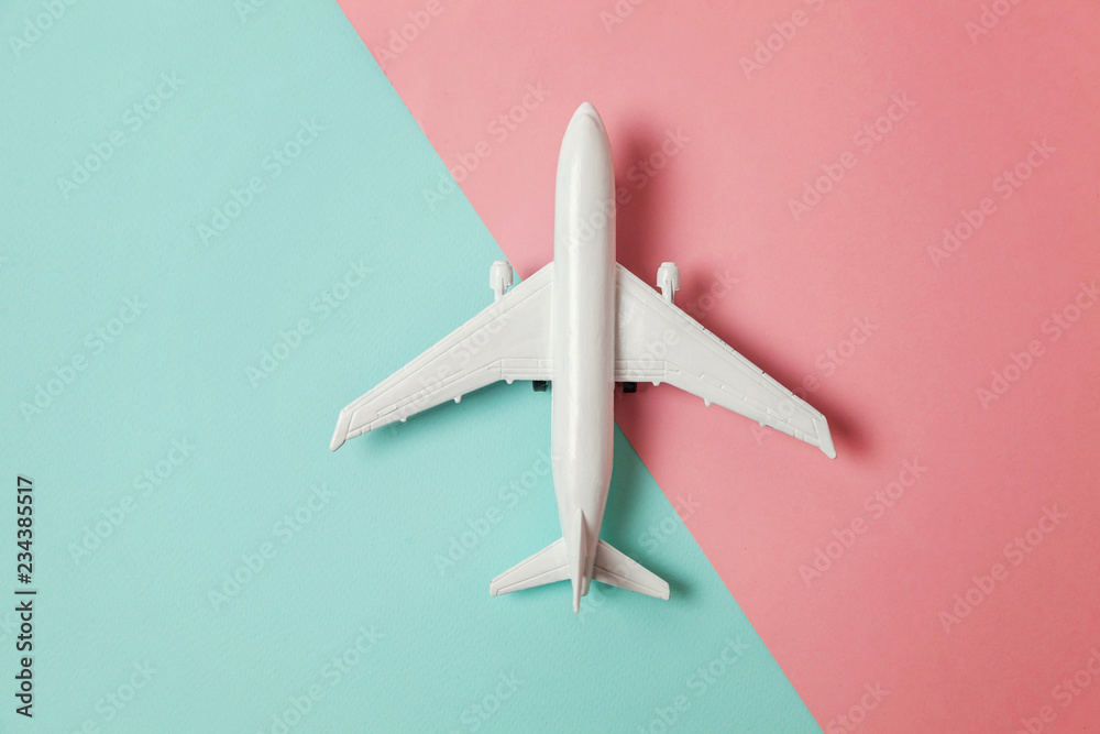 Simply flat lay design miniature toy model plane on blue and pink pastel colorful paper trendy geometric background. Travel by plane vacation summer weekend sea adventure trip concept