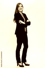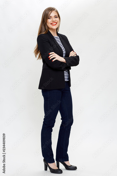 businesswoman in black suit standing with crossed arms.