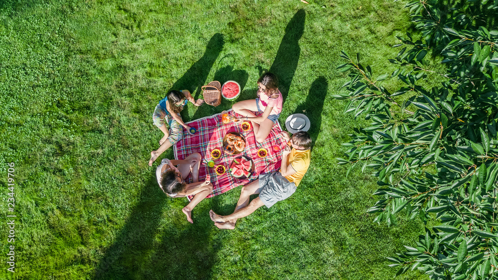 Happy family with children having picnic in park, parents with kids sitting on garden grass and eating healthy meals outdoors, aerial drone view from above, family vacation and weekend concept
