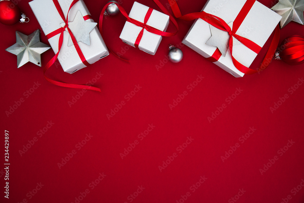 Merry Christmas and Happy Holidays greeting card, frame, banner. New Year. Noel. Silver, white and red Christmas ornaments and fir tree on red background top view. Winter holiday xmas theme. Flat lay.