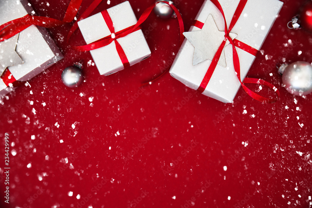Merry Christmas and Happy Holidays greeting card, frame, banner. New Year. Noel. Silver, white and red Christmas ornaments and fir tree on red background top view. Winter holiday xmas theme. Flat lay.