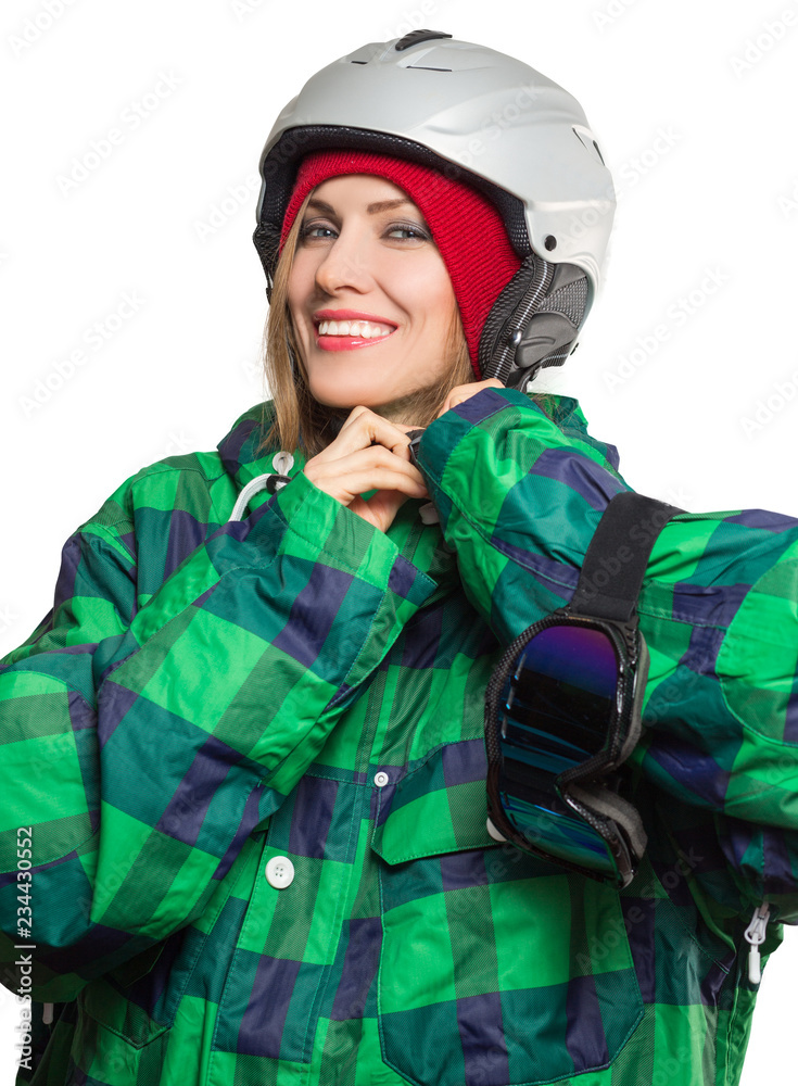 Active young ski woman portrait wearing winter clothing isolated over white