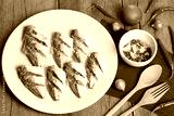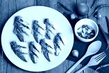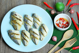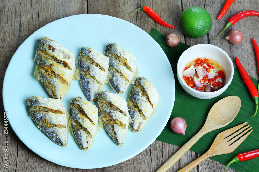Fried Sea fish in plate and fish sauce with spicy on food table.