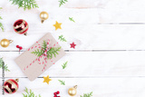 Christmas background concept. Top view of Christmas gift box with spruce branches, pine cones, red berries and bell on white wooden table background.