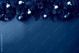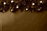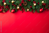 Christmas background concept. Top view of Christmas gift box red sock with spruce branches, pine cones, red berries and bell on red background.