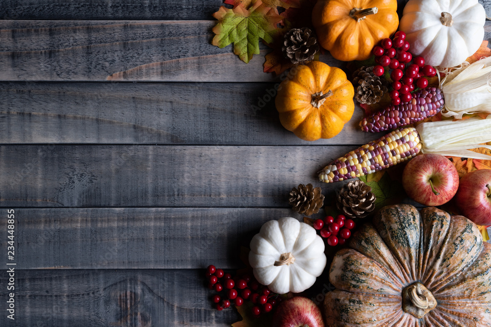 Top view of Autumn maple leaves with Pumpkin, apple, corn and red berries on old wooden background. Thanksgiving day concept.