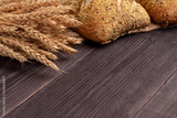 Bread background on black pine boards with wheat, a long loaf and a seed roll. Aromatic crisp bread on dark colorful boards.