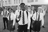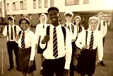 Portrait Of Smiling Male And Female High School Students Wearing Uniform Outside College Building