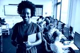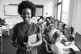 Portrait Of Female Teacher Holding Digital Tablet Teaching Line Of High School Students Sitting By Screens In Computer Class