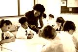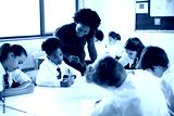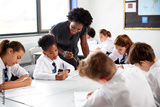 Female High School Tutor Helping Students Wearing Uniform Seated Around Tables In Lesson
