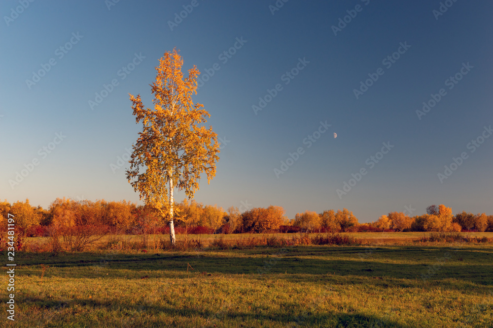 Autumn landscape with trees and mountains at sunset. birch grove. Autumn, fall landscape. Gold trees with colorful leaves