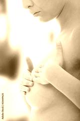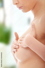 Breast cancer. Woman doing breast cancer self exam BSE with hand. Examination of natural breast for signs of lumps and cancer.