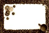 Conceptual coffee background. White background, frame of coffee beans, slices of dried oranges and star anise.