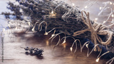 Winter aroma bouquet of dry lavender with christmas lights on a wooden table. Rustic style