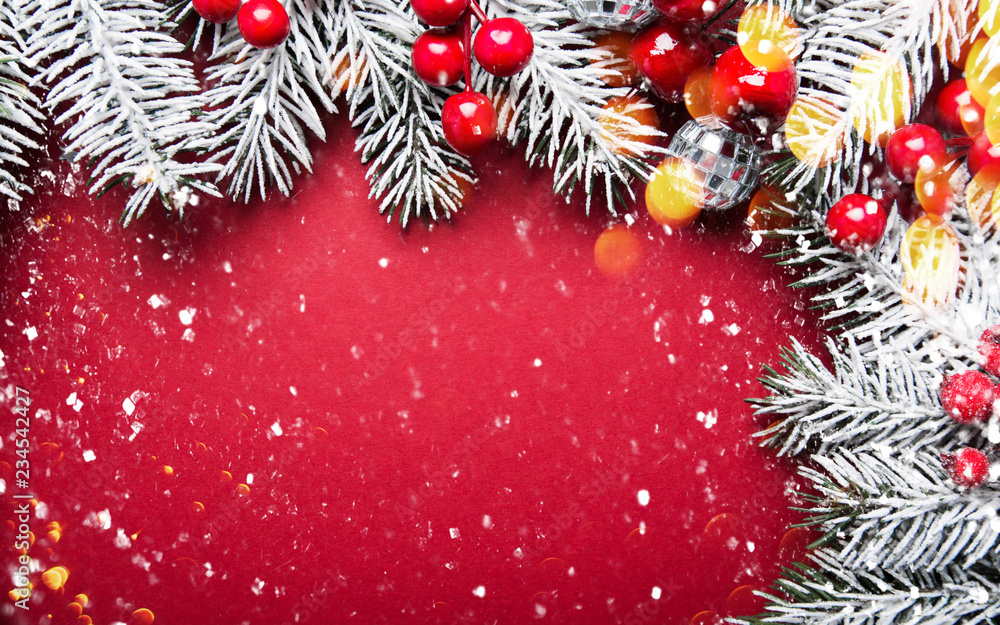 Merry Christmas and Happy Holidays greeting card, frame, banner. New Year. Noel. Silver, white and red Christmas ornaments and fir tree on red background top view. Winter holiday xmas theme. Flat lay.