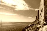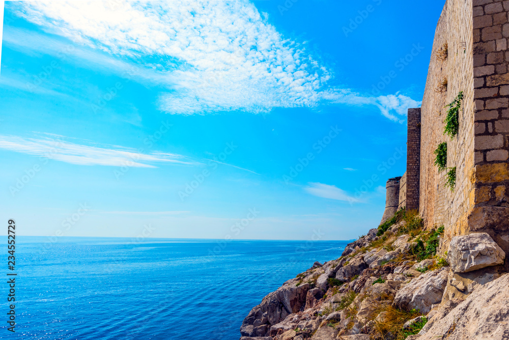 Croatia. Germander. The edge of the Fort wall of the old town on a blue background