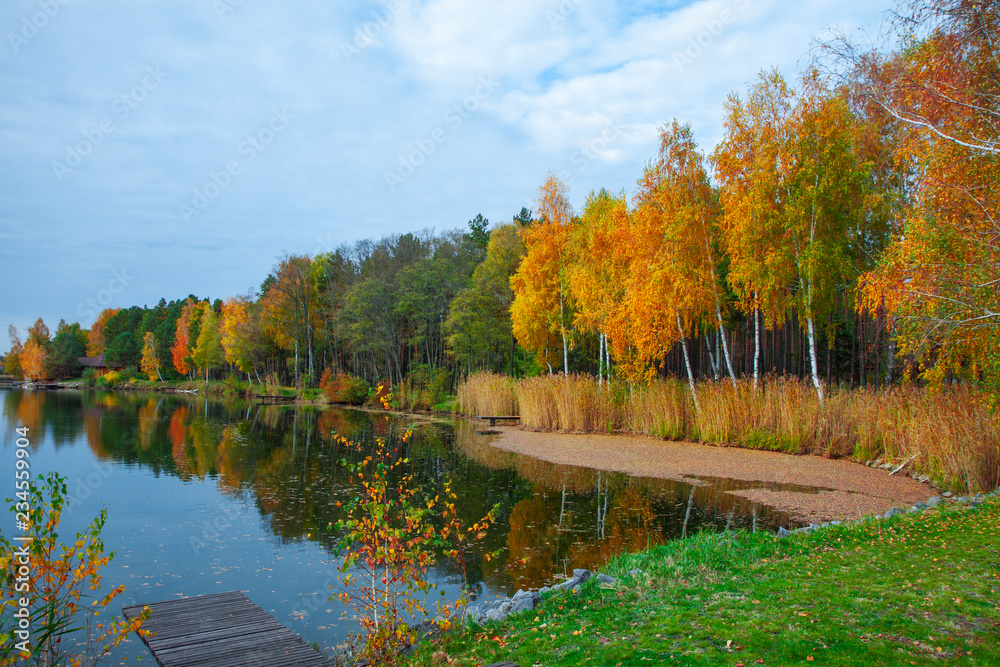 Beautiful autumn trees and bushes in the park. Colorful trees on a bank of lake or river. Autumn landscape.