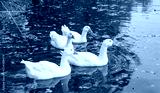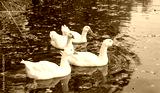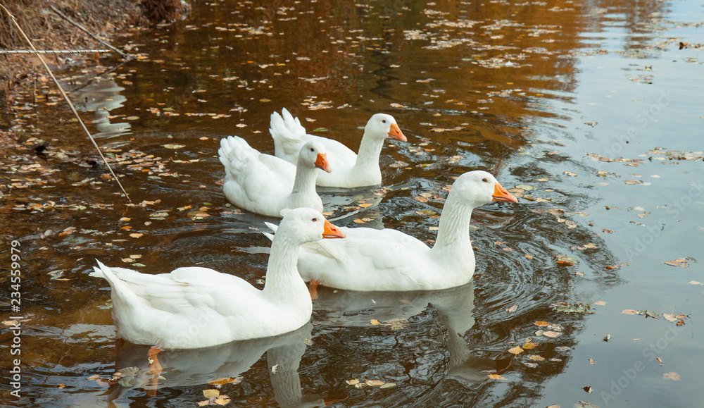 Large white gooses with an orange beaks are reflected in the water. Calm water and fallen leaves. Big, important, slow bird.