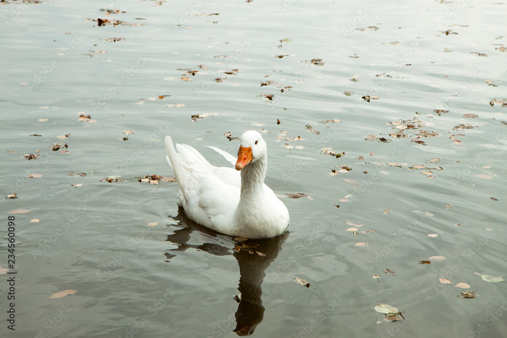 Large white goose with an orange beak. Calm water and fallen leaves. Domestic bird.