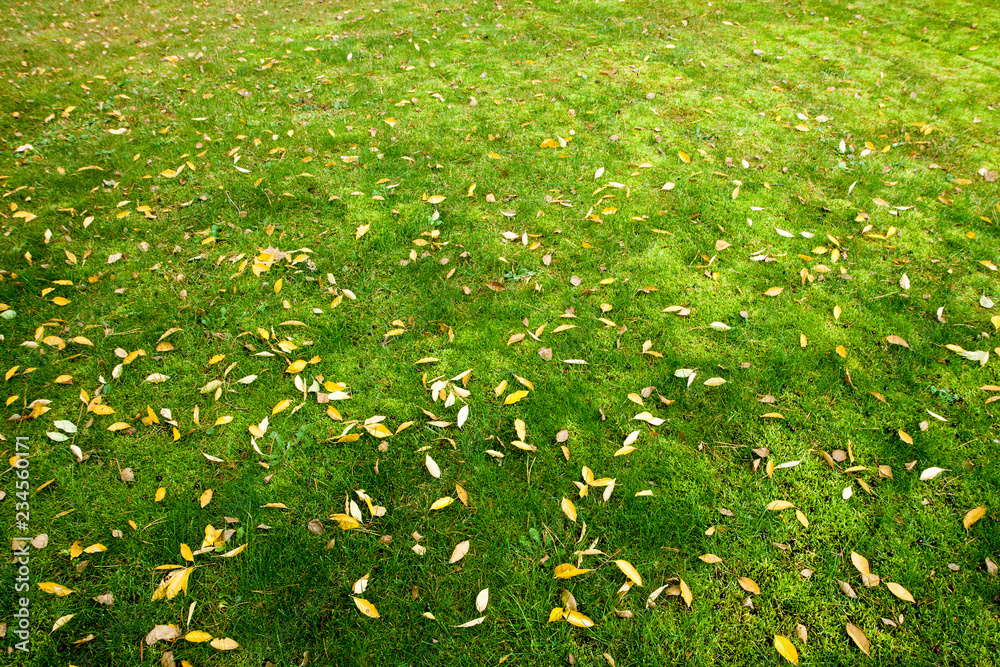Green grass with autumn leaves of the sun. Green background with fallen leaves.