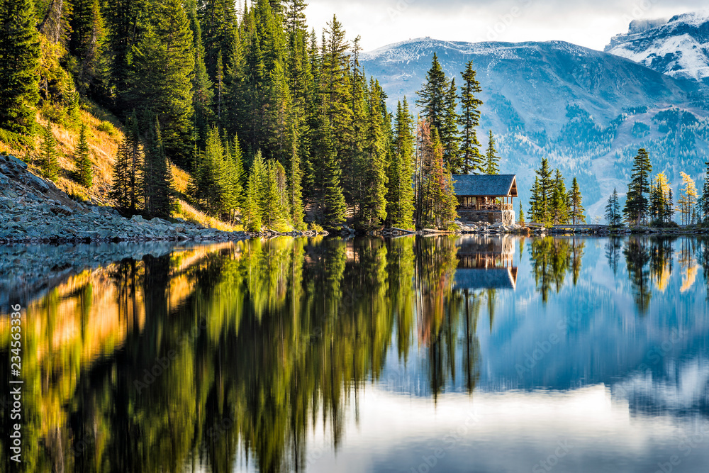 lake in the mountains with cabin