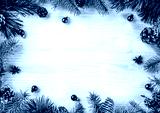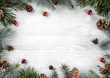 Creative frame made of Christmas fir branches on white wooden background with red decoration, pine cones. Xmas and New Year theme. Flat lay, top view