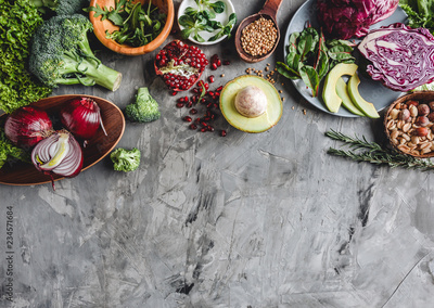 Assortment of fresh organic farmer vegetables food for cooking vegan vegetarian diet and nutrition. Healthy food, clean eating, top view, flat lay, copy space