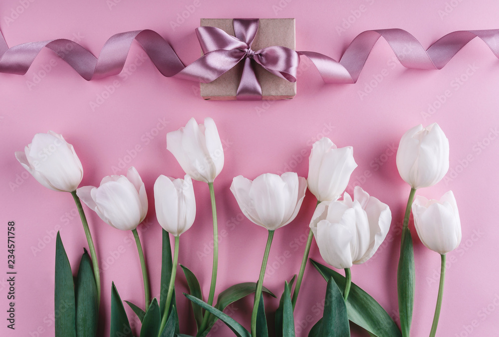 White tulips flowers and gift over light pink background. Greeting card or wedding invitation. Flat lay, top view, copy space