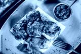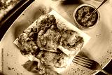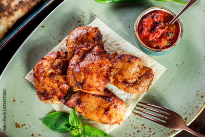 Chicken skewers with tomato sauce and greens served with glass of wine on a plate. Hot Meat Dishes. Top view