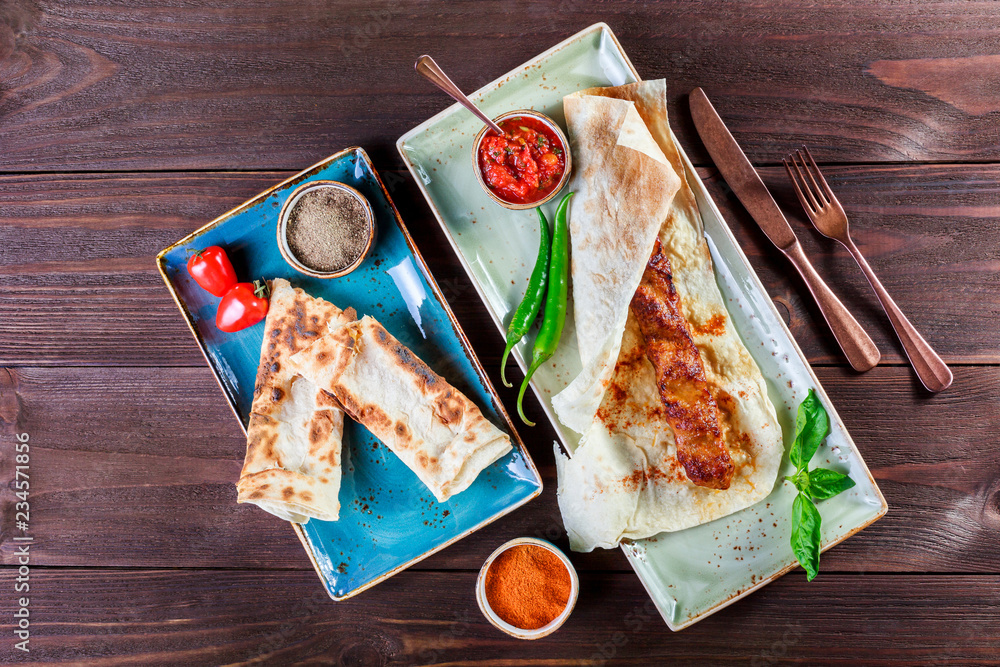 Chicken kebab with pita bread, tomato sauce and cognac on wooden background. Hot Meat Dishes. Top view