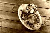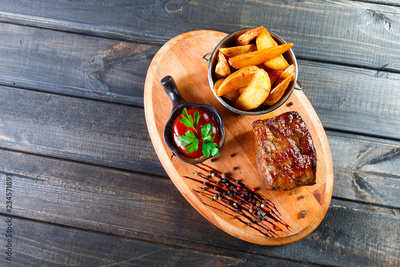 Grilled beaf steak with sauce and potatoes fries in a bucket on wooden cutting board