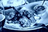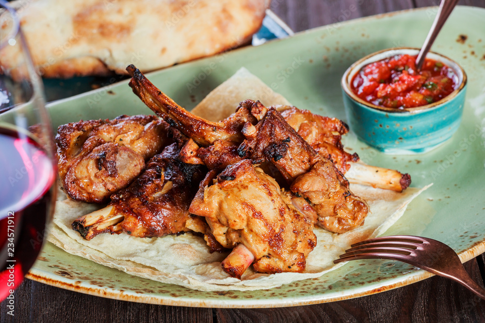 Roasted rabbit with herbs, tomato sauce and glass of wine on a plate. Hot Meat Dishes