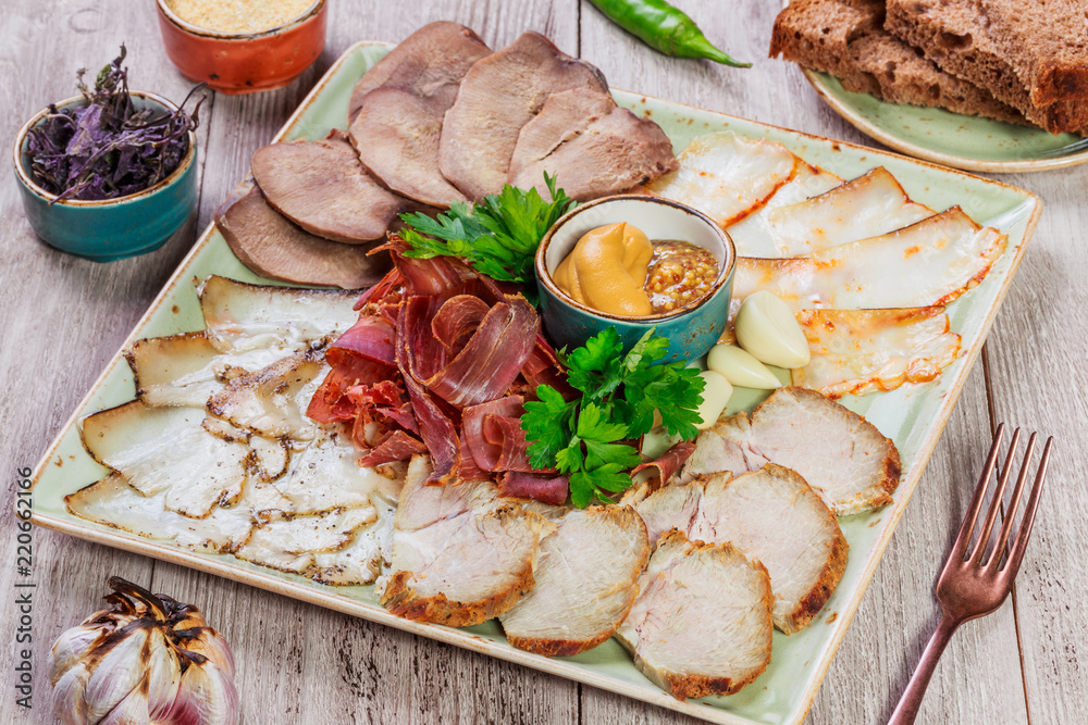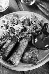 Grilled Beef steak with fresh vegetable salad, tomatoes and sauce on wooden cutting board