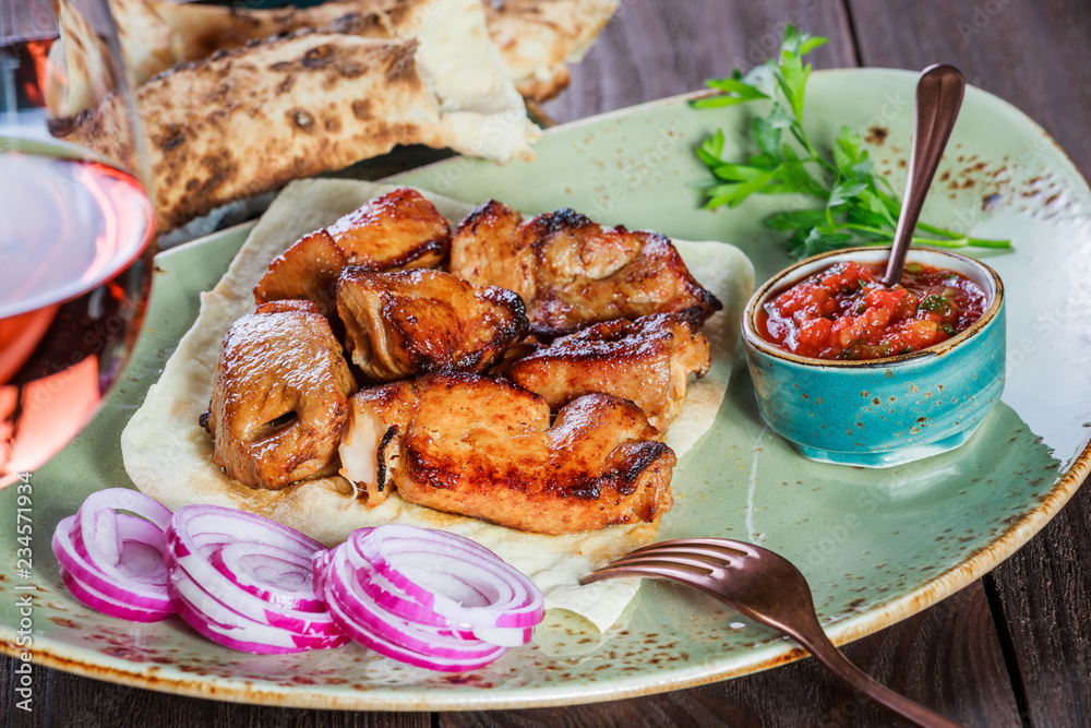 Grilled pork skewers with tomato sauce and greens served with glass of wine on a plate. Hot Meat Dishes. Top view