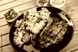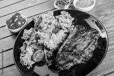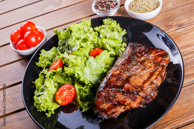 Grilled pork steak meat with fresh vegetable salad and tomatoes on black plate, wooden background