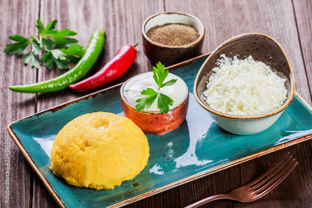 Delicious polenta - Corn porridge hominy with goat cheese, butter and sour cream on wooden background. Healthy food. Top view