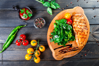 Grilled chicken fillet with fresh vegetable salad, tomatoes and sauce on wooden cutting board. Hot Meat Dishes. Top view