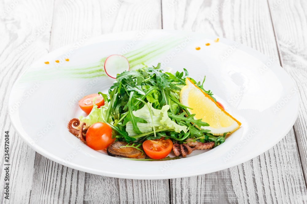 Seafood salad with mussels, squids, octopus, arugula, lettuce and cherry tomatoes on wooden background close up. Mediterranean food