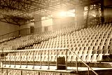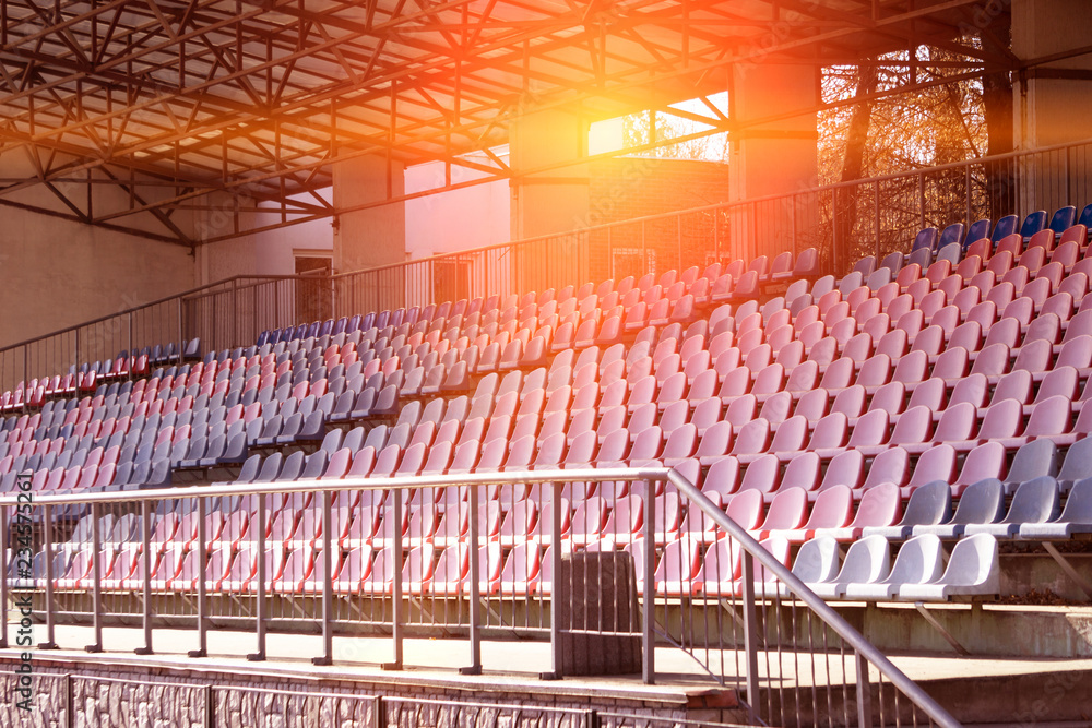 background of empty tribune with a beautiful glare at the central city stadium in the central park of the city of Vinnitsa, sport, football, industrial architecture