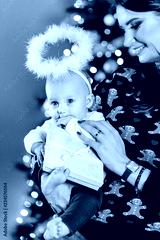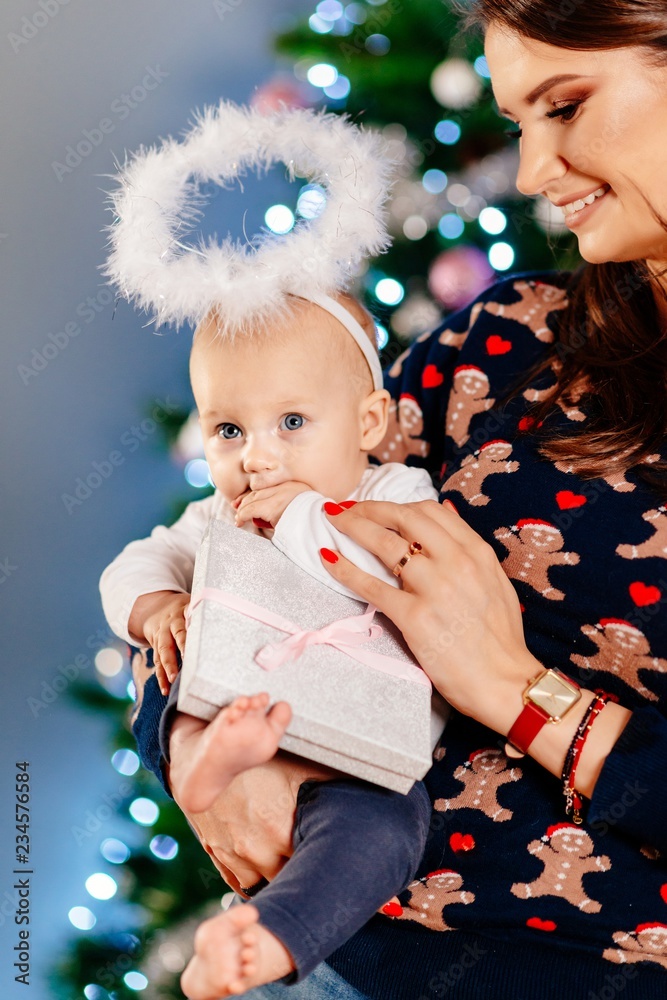 Alone mother with her baby at Christmas.