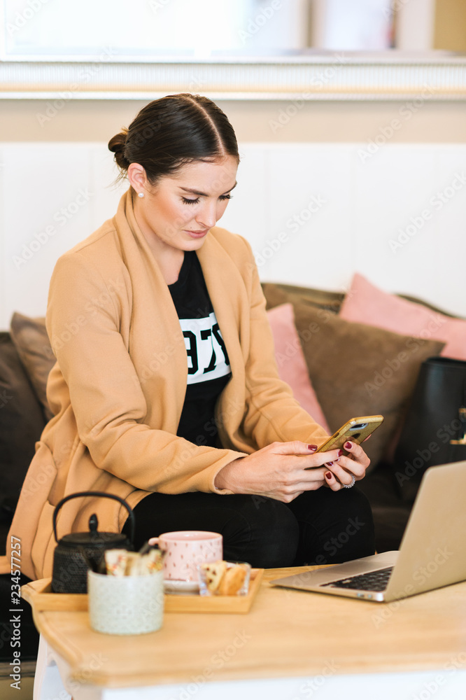 Young beautiful woman typing message with smartphone, resting in coffee shop, open laptop on the table