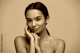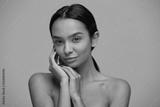 Head shot of an attractive mixed race girl, looking gently and tenderly, demonstrates healthy beautiful skin, calm and pleased, keeps hands near the face, over beige background