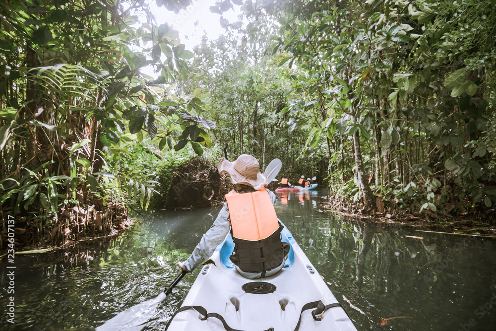woman kayaker kayaking on river in forest on cloudy day