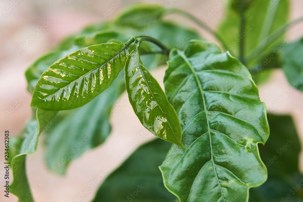 Robusta coffee trees in the garden, coffee plantation. They have a greater crop yield than that of arabica and contains more caffeine. It is less susceptible to pests and disease.