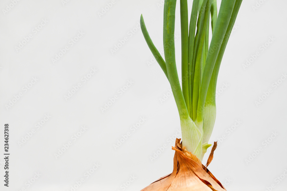 sprouted onions in a pot on a white background