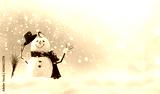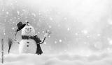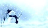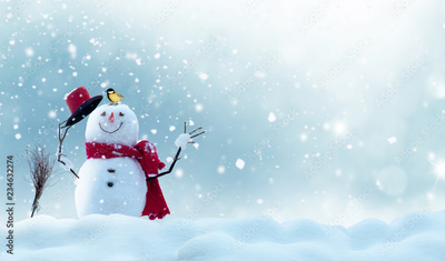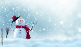Merry christmas and happy new year greeting card with copy-space.Happy snowman standing in winter christmas landscape.Snow background